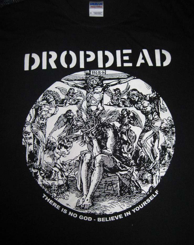 Dropdead T-shirt. White print on black Gildan/Yazbek shirt. Distro item, only a few shirts from each size are available.