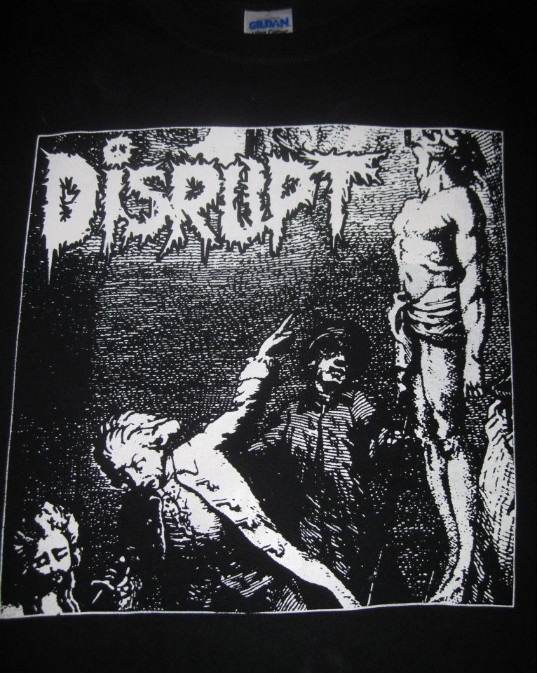 Disrupt T-shirt. Image from the Warcollapse split. White print on black Gildan/Yazbek shirt. Distro item, only a few shirts from each size are available.