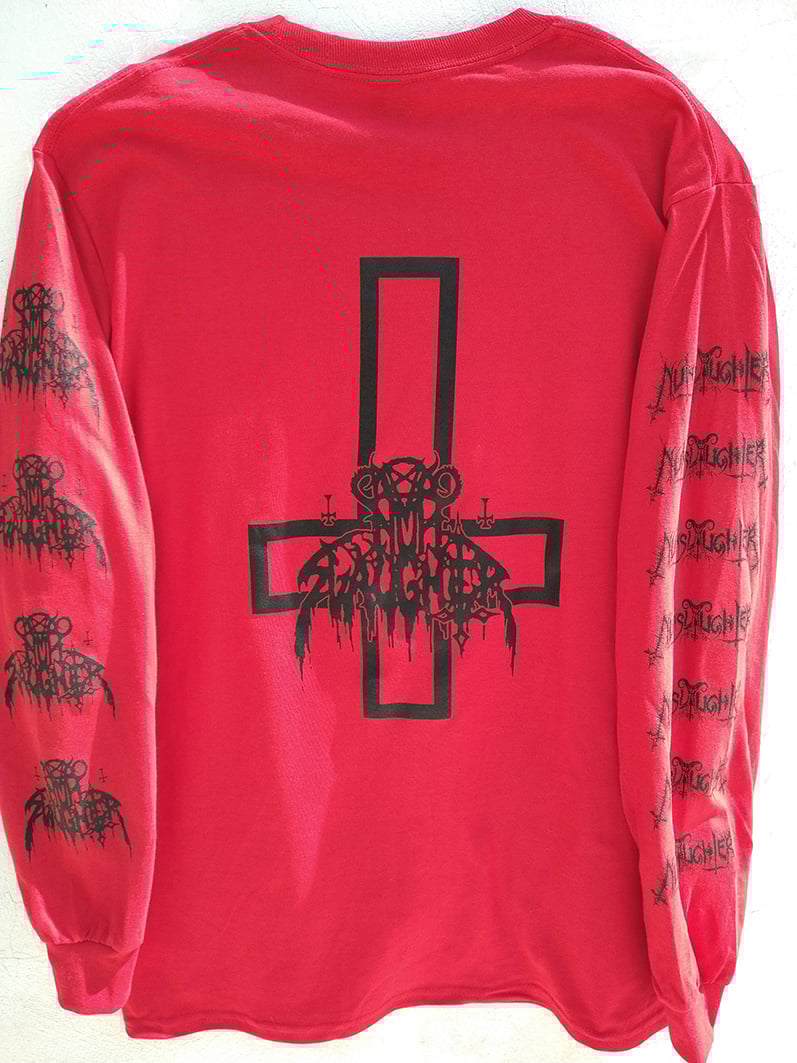 Nunslaughter Longsleeve shirt This shirt is printed on the front, back and also both sleeves. OFFICIAL MERCH Gildan/Yazbek shirts. 100 % COTTON.